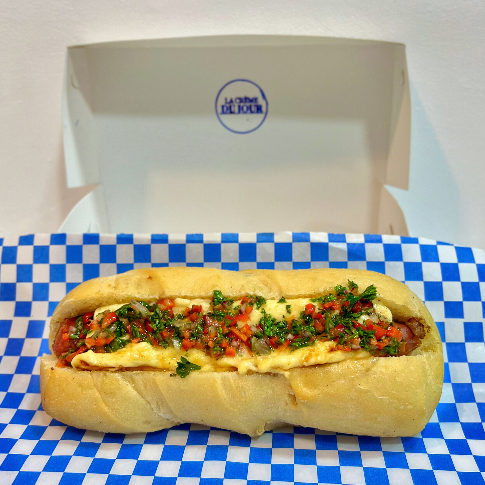 Chorizo santarrosano a la parrilla con una porción de queso criollo asado a la plancha, acompañado de salsa chimichurri de la casa y cebolla crujiente en nuestro pan artesanal tipo masa madre